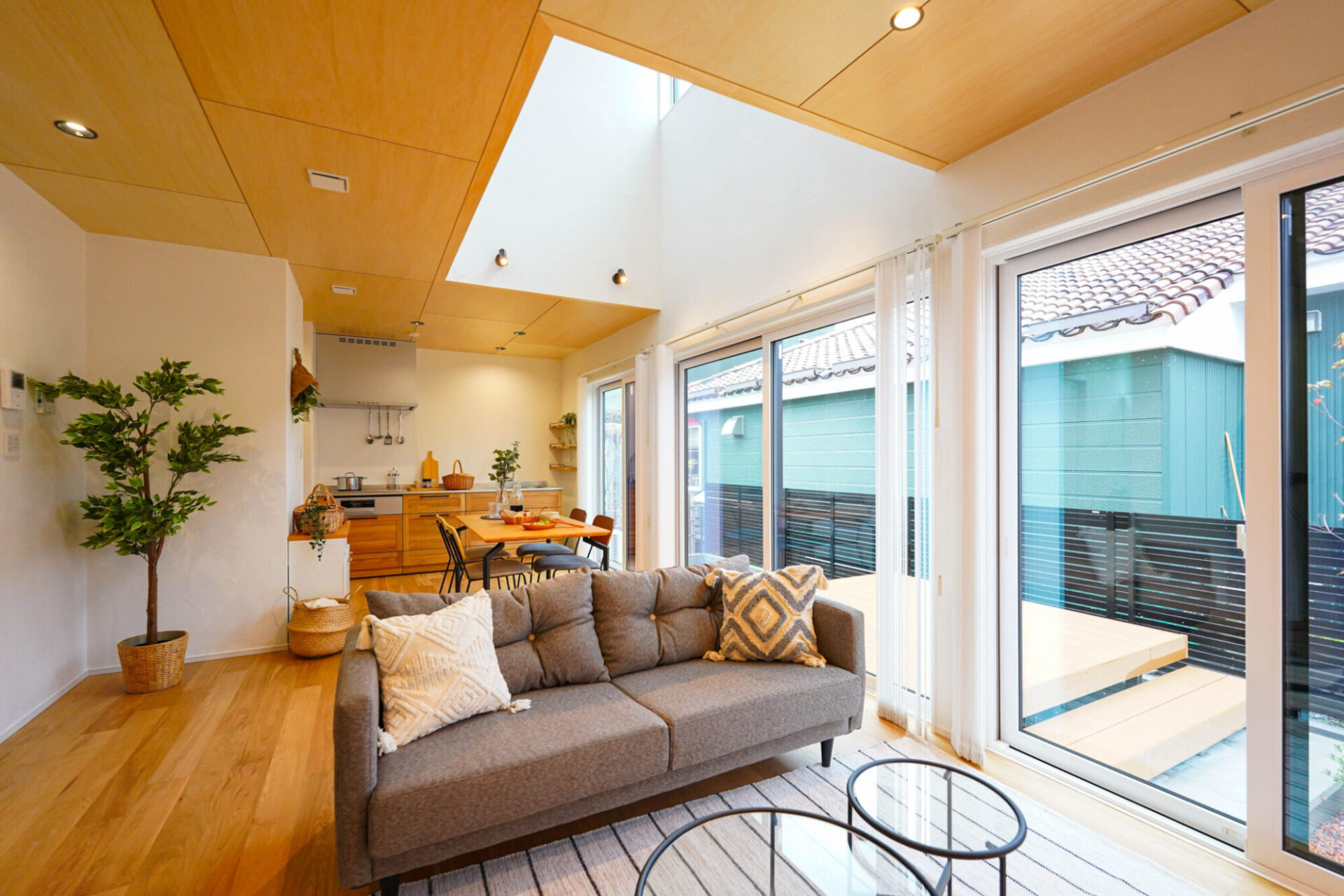 吹き抜けと東側の開口からたっぷりと陽が差し込むLDK。キッチン横にはパントリー、ダイニング横にはウッドデッキと、横にも広がるスペースで広々。